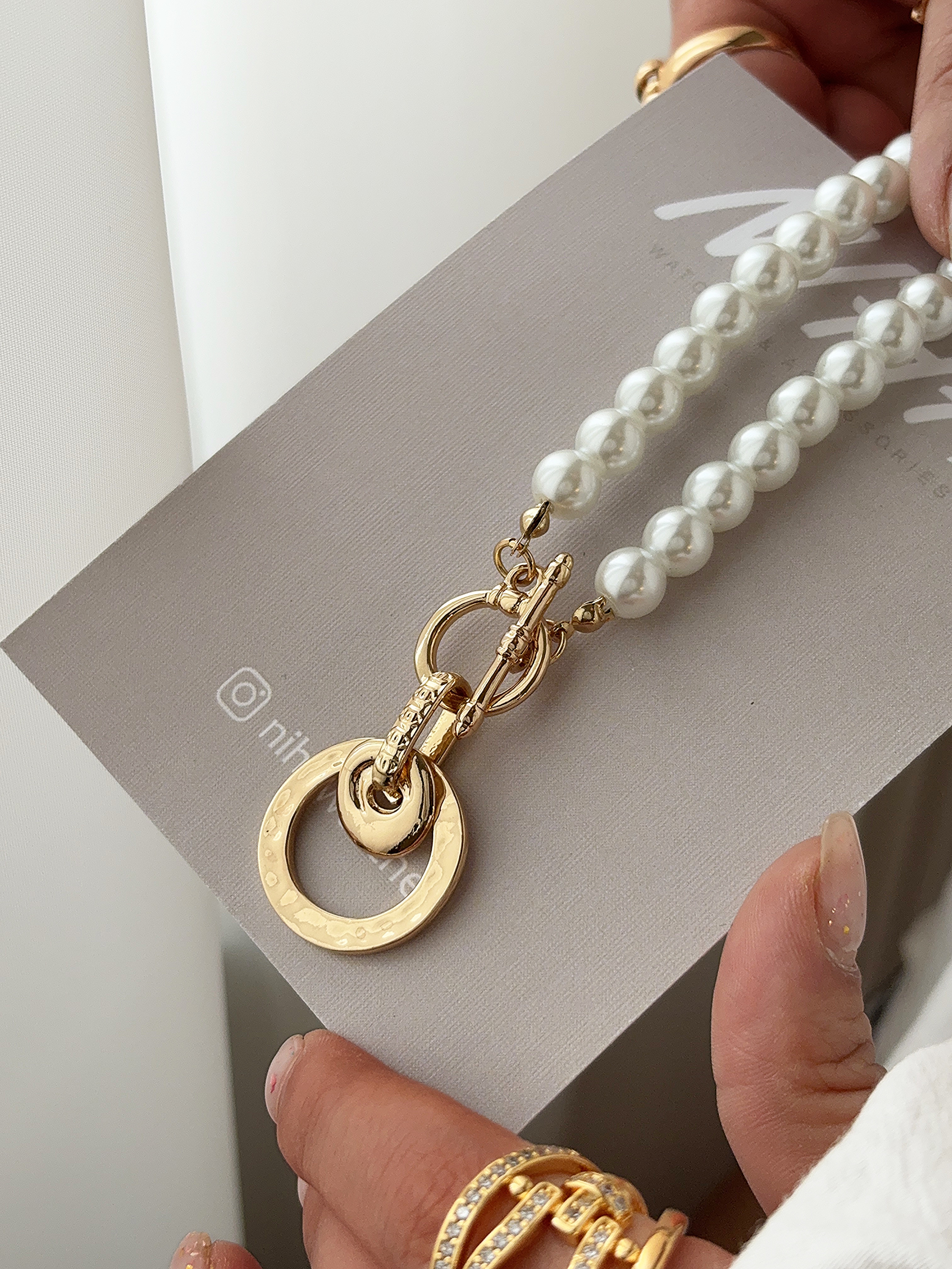 گردنبند مرواریدی زنانه با آویز دایرهای طلایی، ترکیبی از زیبایی کلاسیک و طراحی مدرن است. مرواریدهای براق در کنار قفل و آویز خاص، جلوهای لوکس و چشمگیر به استایل شما میبخشند. مناسب برای مجالس رسمی و استایل روزمره شیک، این گردنبند زنانه گزینهای ایدهآل برای هدیه و تکمیل استایل خاص شماست