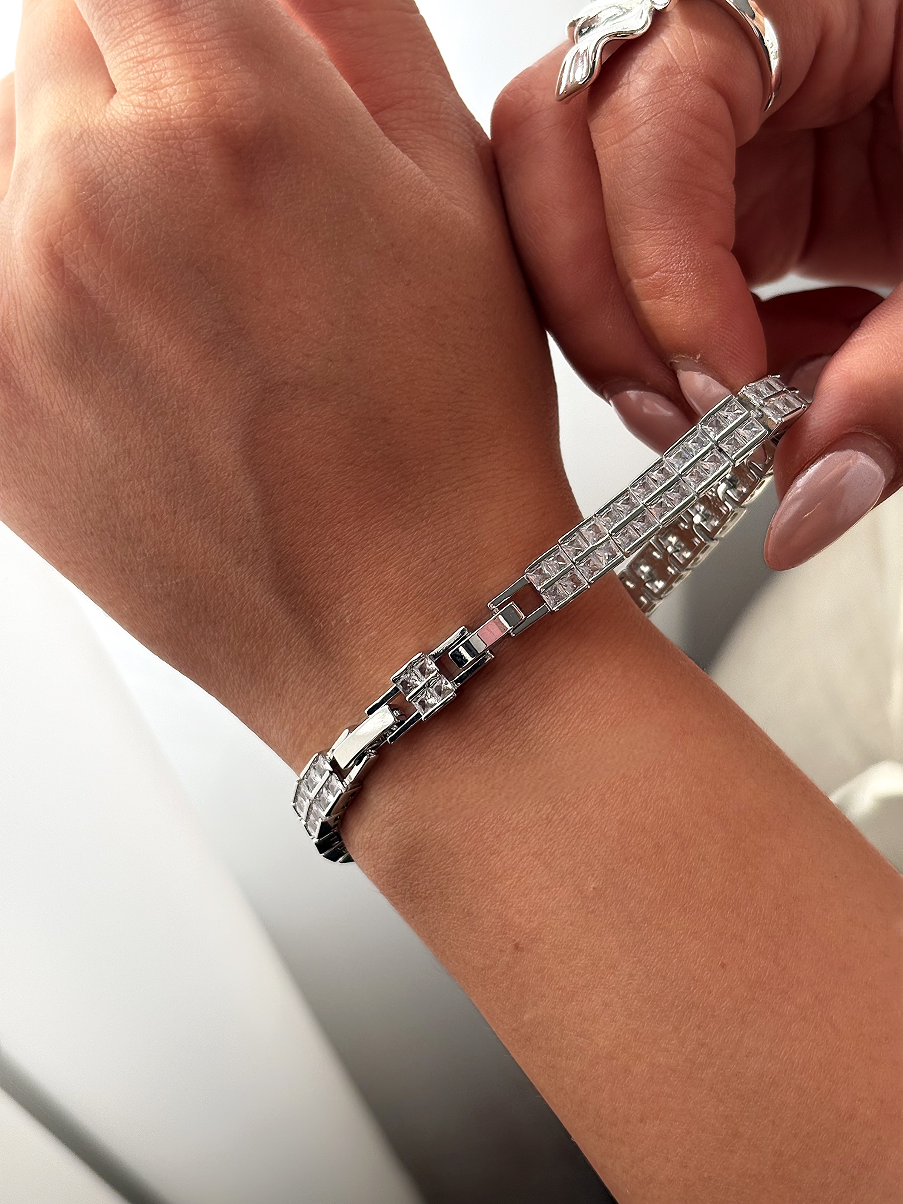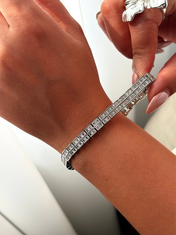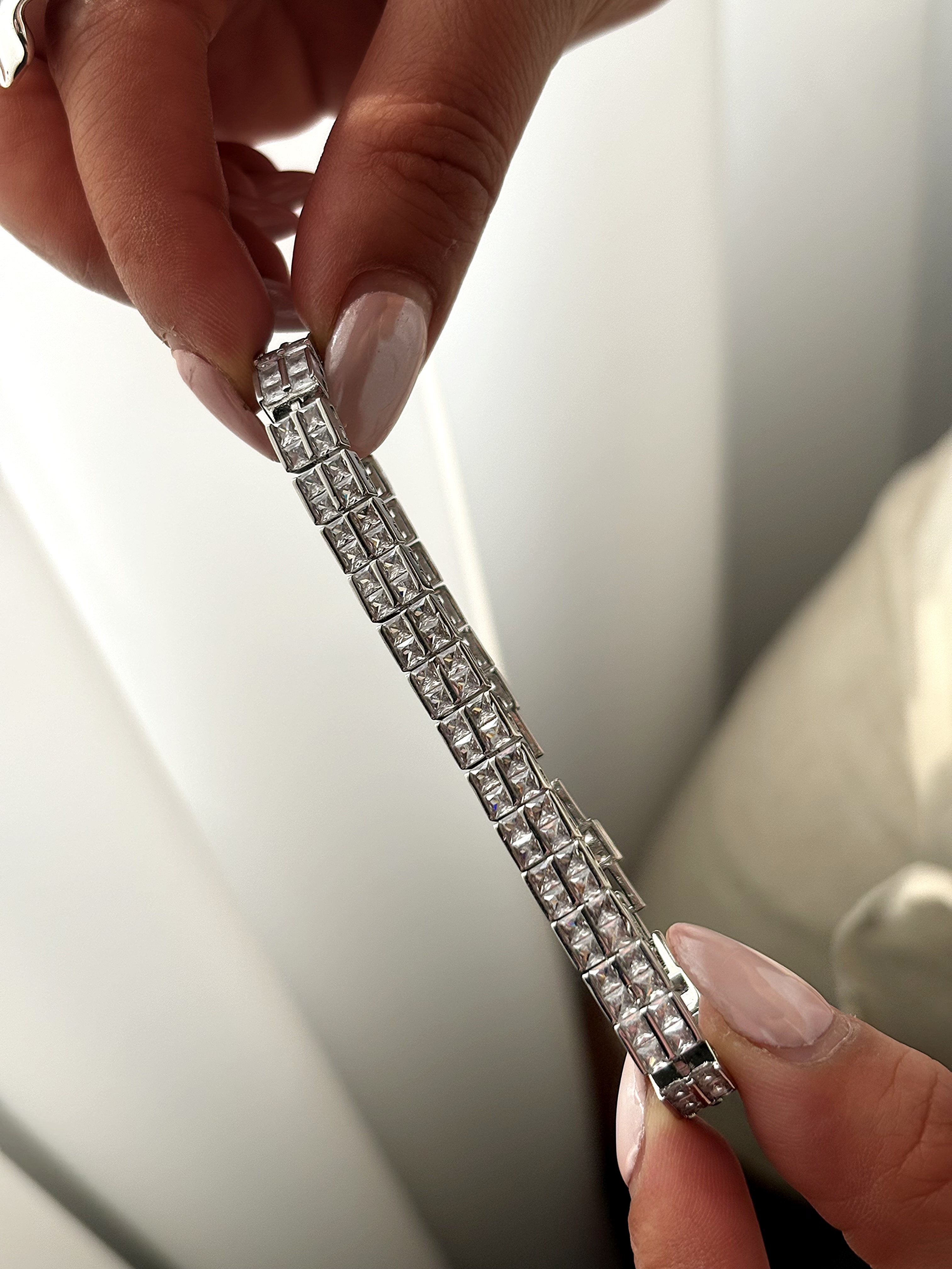 دستبند زنانه نقرهای با طراحی لوکس و نگینهای مربعی درخشان، جلوهای از ظرافت و زیبایی را به نمایش میگذارد. این دستبند سبک تنيسی، مناسب استایلهای رسمی و روزمره بوده و با حلقه گلدار هماهنگ میشود. انتخابی عالی برای هدیه دادن و تکمیل استایل شیک و مدرن شماست.