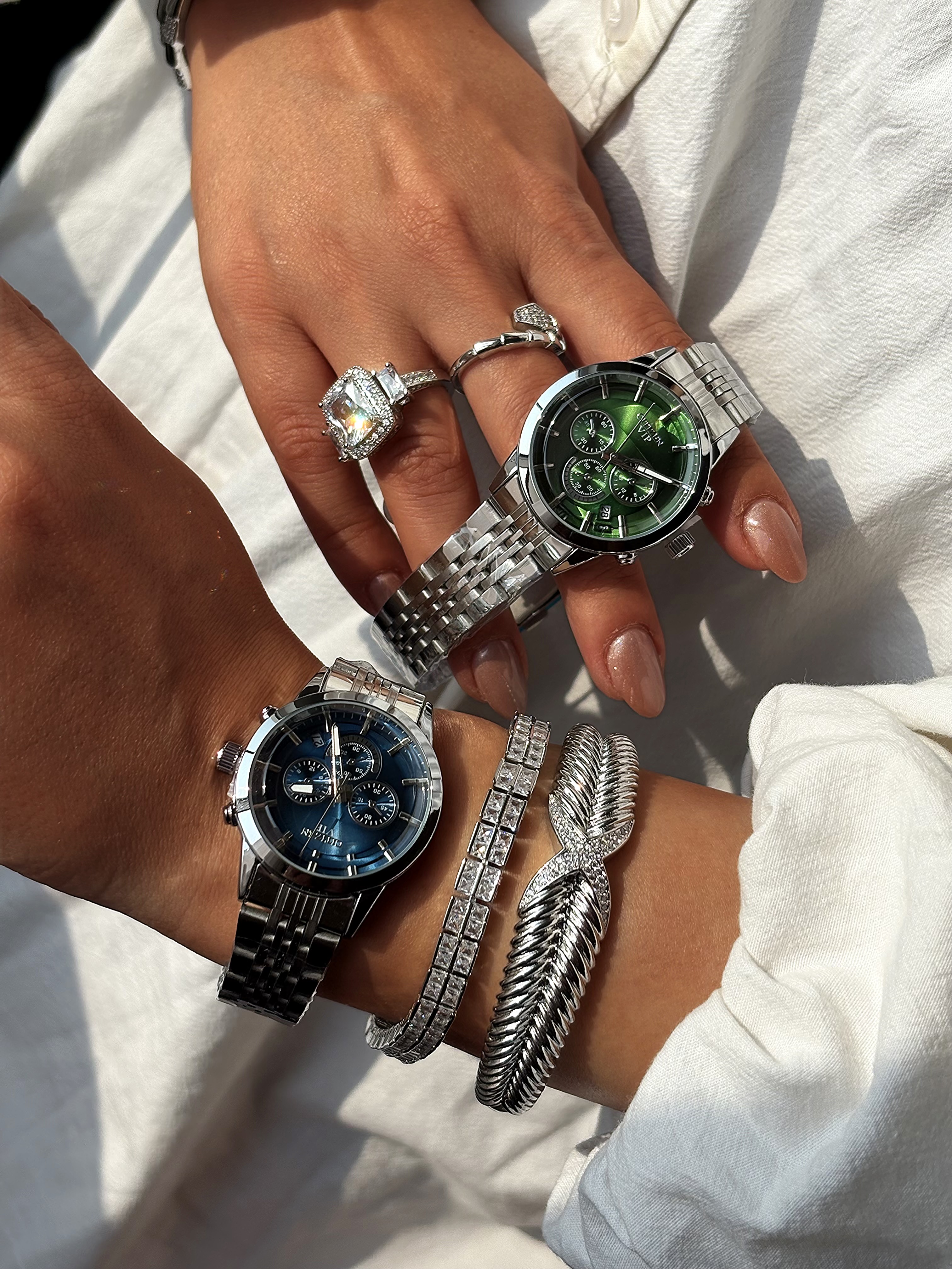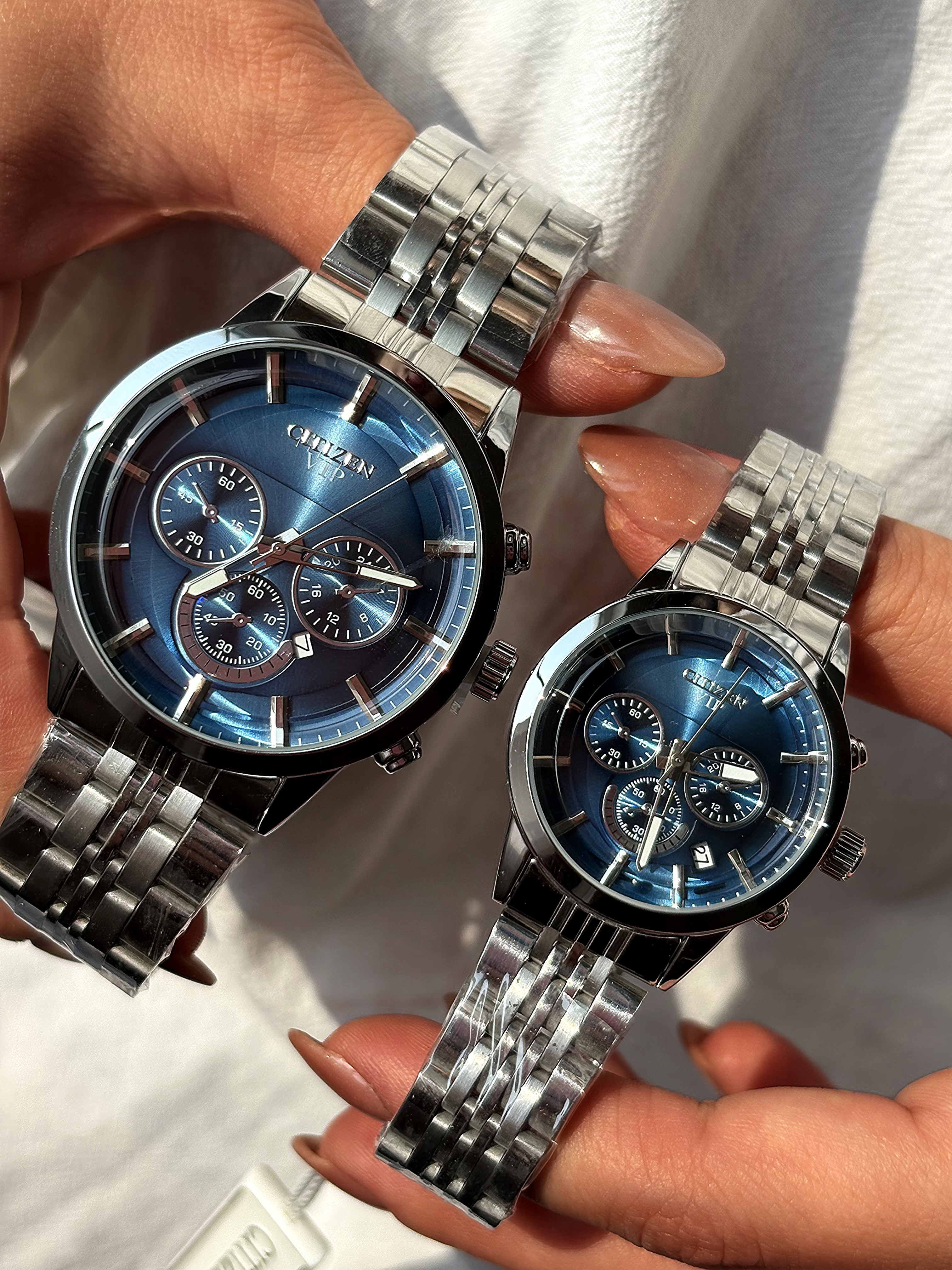 ست ساعت سیتیزن با صفحه سبز و طراحی کرنوگراف، انتخابی لوکس برای زوجهای شیکپوش است.