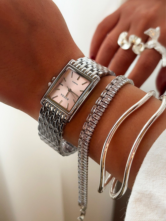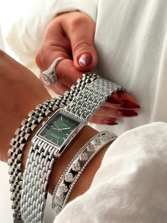 ساعت مچی زنانه برند رویدا با طراحی مستطیلی و بند فلزی حصیری، ترکیبی از ظرافت مینیمال و تنوع رنگی جذاب را ارائه میدهد. صفحههای سفید، مشکی و سبز با نشانگرهای ساده و موتور کوارتز دقیق، جلوهای شیک و کاربردی به استایل شما میبخشند. بند استیل ضد حساسیت با رنگ ثابت، راحتی و دوام بالا را برای استفاده روزمره و رسمی تضمین میکند. این مدلها قابلست با لباسهای سفید، مشکی یا سبز بوده و انتخابی عالی برای بانوان خوشسلیقه و هدیهای خاص در مناسبتهایی مثل تولد، سالگرد یا روز زن محسوب میشوند.