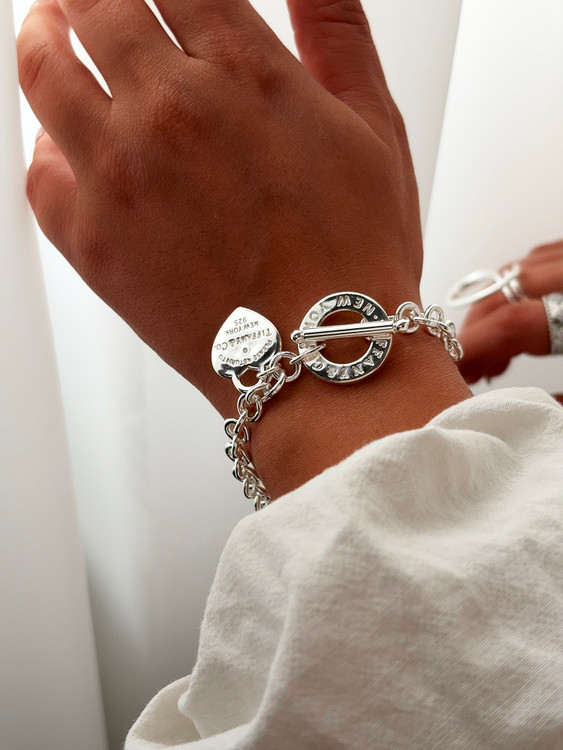 دستبند زنانه تیفانی با طراحی کلاسیک و پلاک قلبی حکاکیشده، نمادی از اصالت و ظرافت در دنیای جواهرات لوکس است. ساختهشده از استیل ۳۱۶ با قفل حلقهای، این مدل راحتی، دوام و جلوهای خاص را برای استفاده روزمره و رسمی فراهم میکند. نوشتهی “PLEASE RETURN TO TIFFANY & CO. NEW YORK” روی پلاک، امضای نمادین برند تیفانی است که به استایل شما هویت میبخشد. قابلست با ساعتهای نقرهای و لباسهای سفید یا مشکی، این دستبند انتخابی عالی برای بانوان خوشسلیقه و هدیهای ماندگار در مناسبتهایی مثل تولد، سالگرد یا روز زن محسوب میشود.