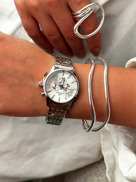 ساعت مچی زنانه الگانس با طراحی کرنوگراف و موومنت ژاپنی، ترکیبی از زیبایی مدرن و عملکرد دقیق را به استایل شما میبخشد. صفحه گرد با سه موتور تزئینی و نمایشگر تاریخ، جلوهای حرفهای و جذاب دارد. بند و بدنه استیل نقرهای با رنگ ثابت، در برابر رطوبت و تغییر رنگ مقاوم بوده و مناسب استفاده روزمره و رسمی است. موتور ژاپنی با منبع انرژی باتری، دقت و دوام بالا را تضمین میکند. قابلست با اکسسوریهای نقرهای و لباسهای کلاسیک، این ساعت انتخابی عالی برای هدیه در مناسبتهایی مثل تولد، سالگرد یا روز زن محسوب میشود.