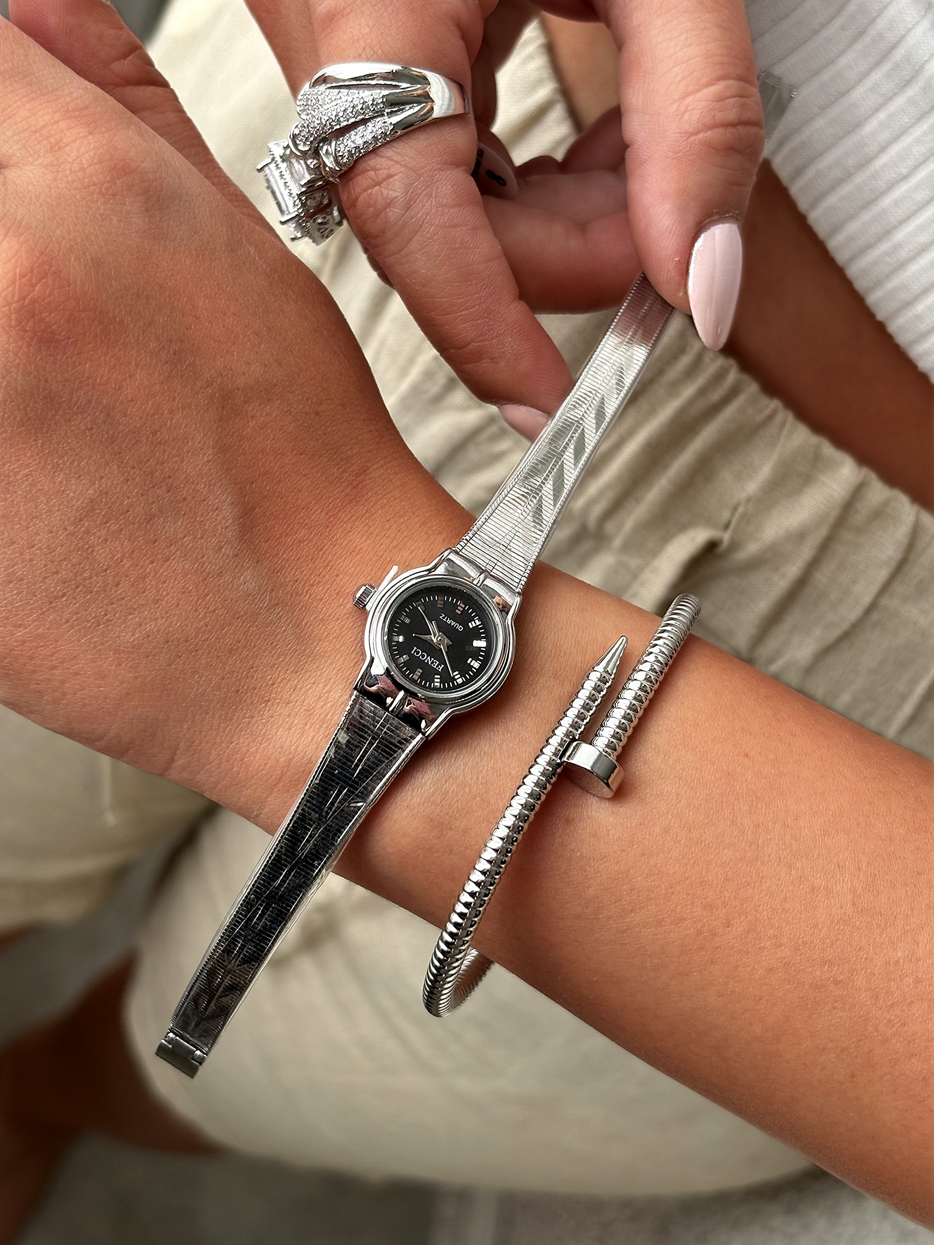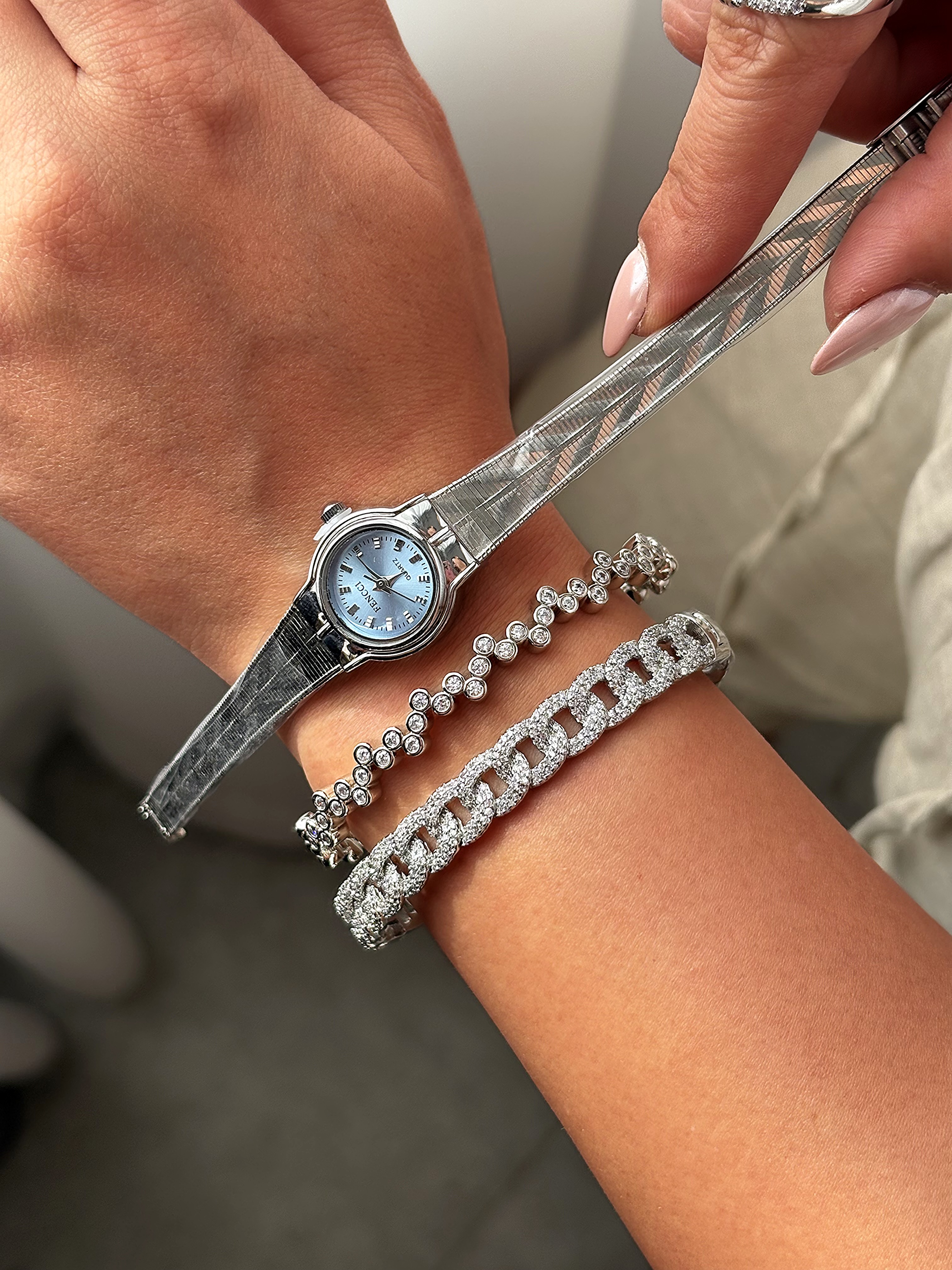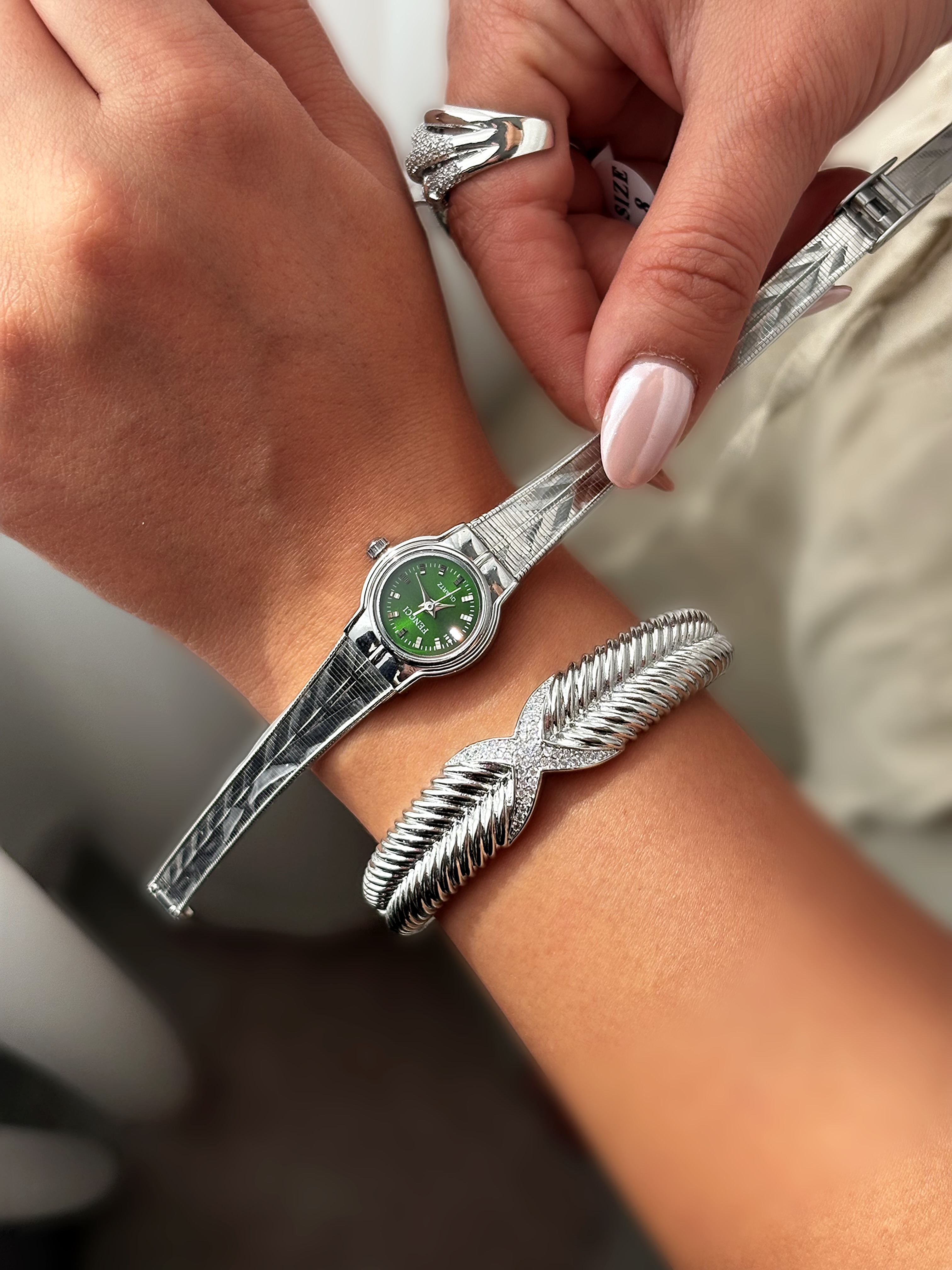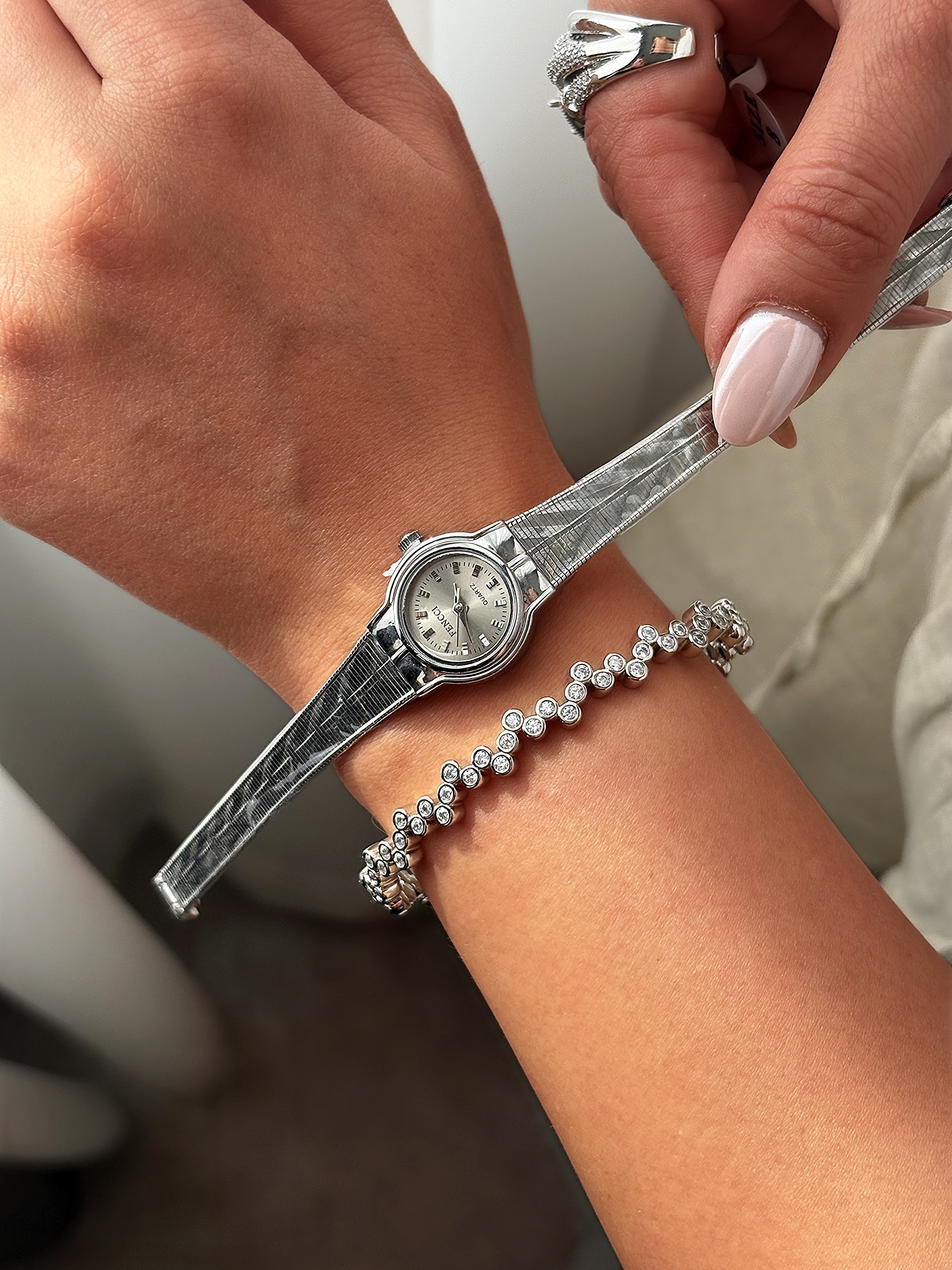 ساعت مچی زنانه فلورا با طراحی ظریف و بند استیل براق، جلوهای شیک و کلاسیک به استایل شما میبخشد. صفحههای متنوع در رنگهای سفید، مشکی، آبی و سبز، مناسب سلیقههای مختلف است. سبک، بادوام و مقاوم در برابر رطوبت، با موتور دقیق و کیفیتی ایدهآل برای استفاده روزمره و رسمی.