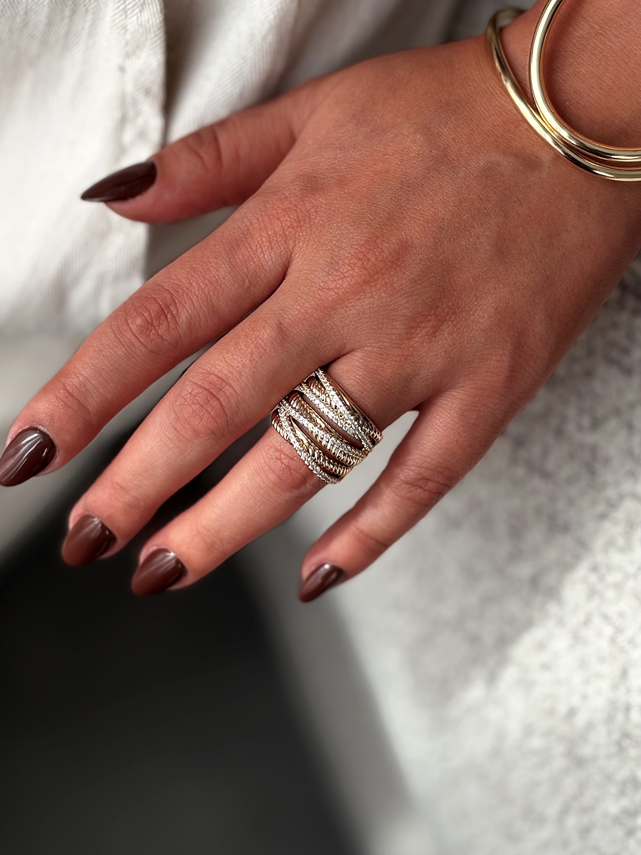 انگشتر زنانه لوکس چندردیفه با طراحی خاص و مدرن، ساخته شده از فلز مقاوم با روکش طلایی و نگینهای درخشان کریستالی. این انگشتر پهن و براق با جلوهای چشمگیر، انتخابی ایدهآل برای استایلهای رسمی و روزمره است. مناسب برای هدیه به بانوان خوشسلیقه و قابل استفاده در مجالس و مهمانیها.