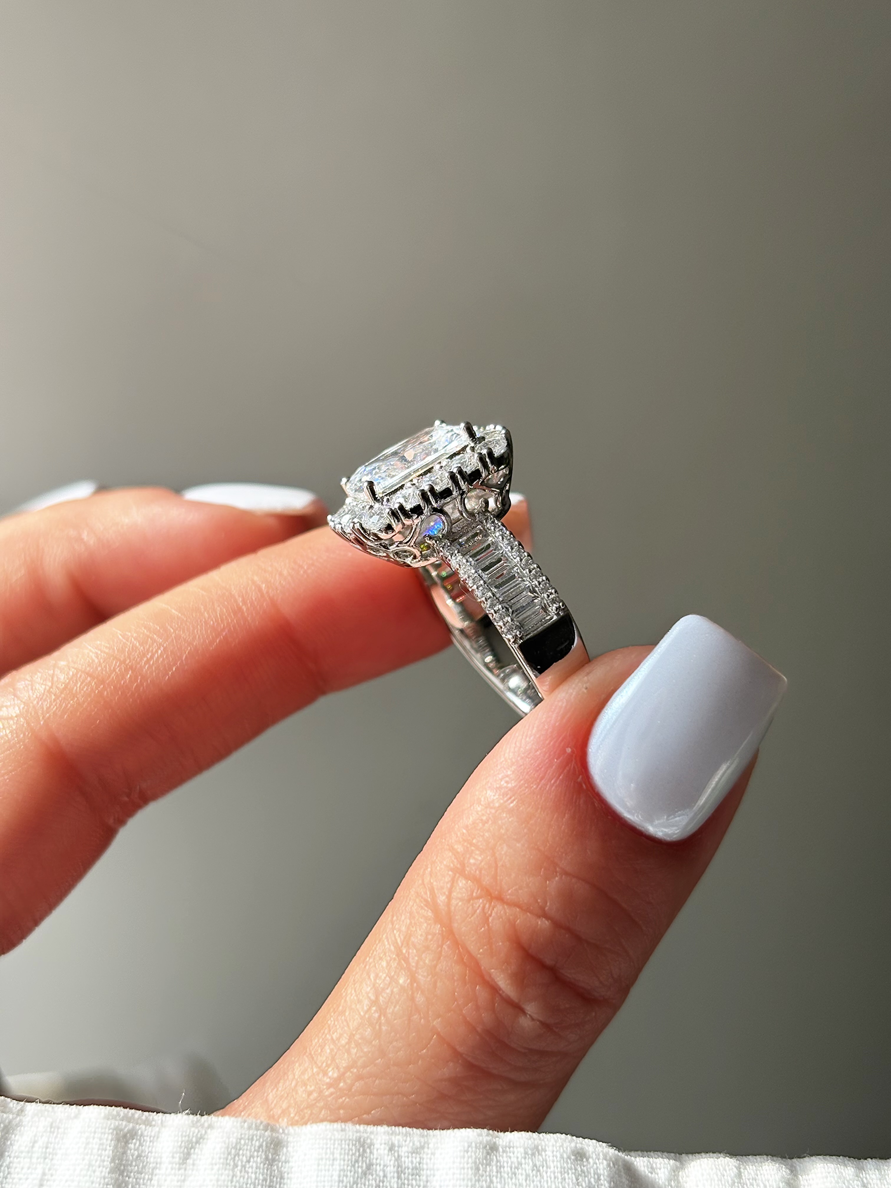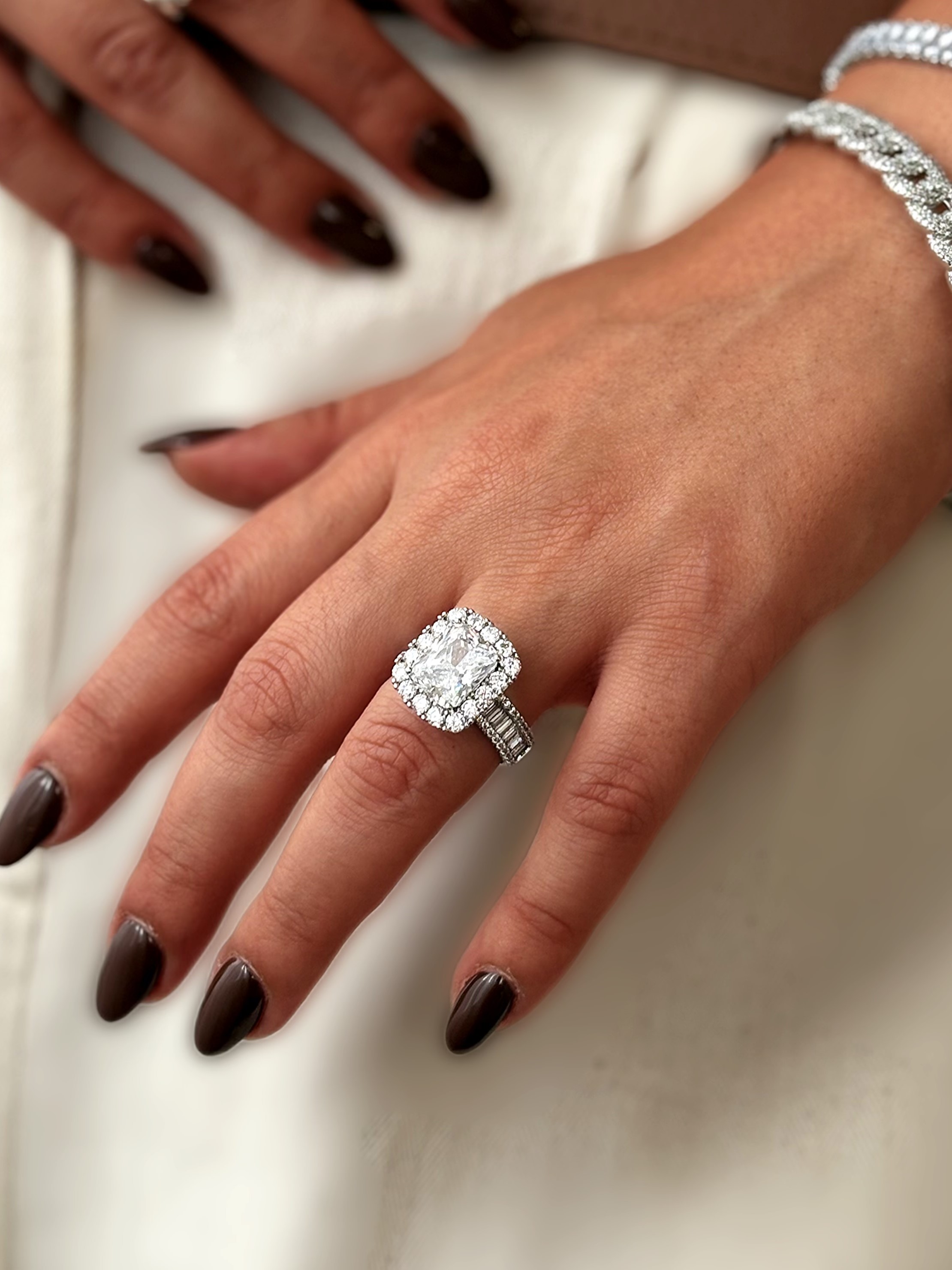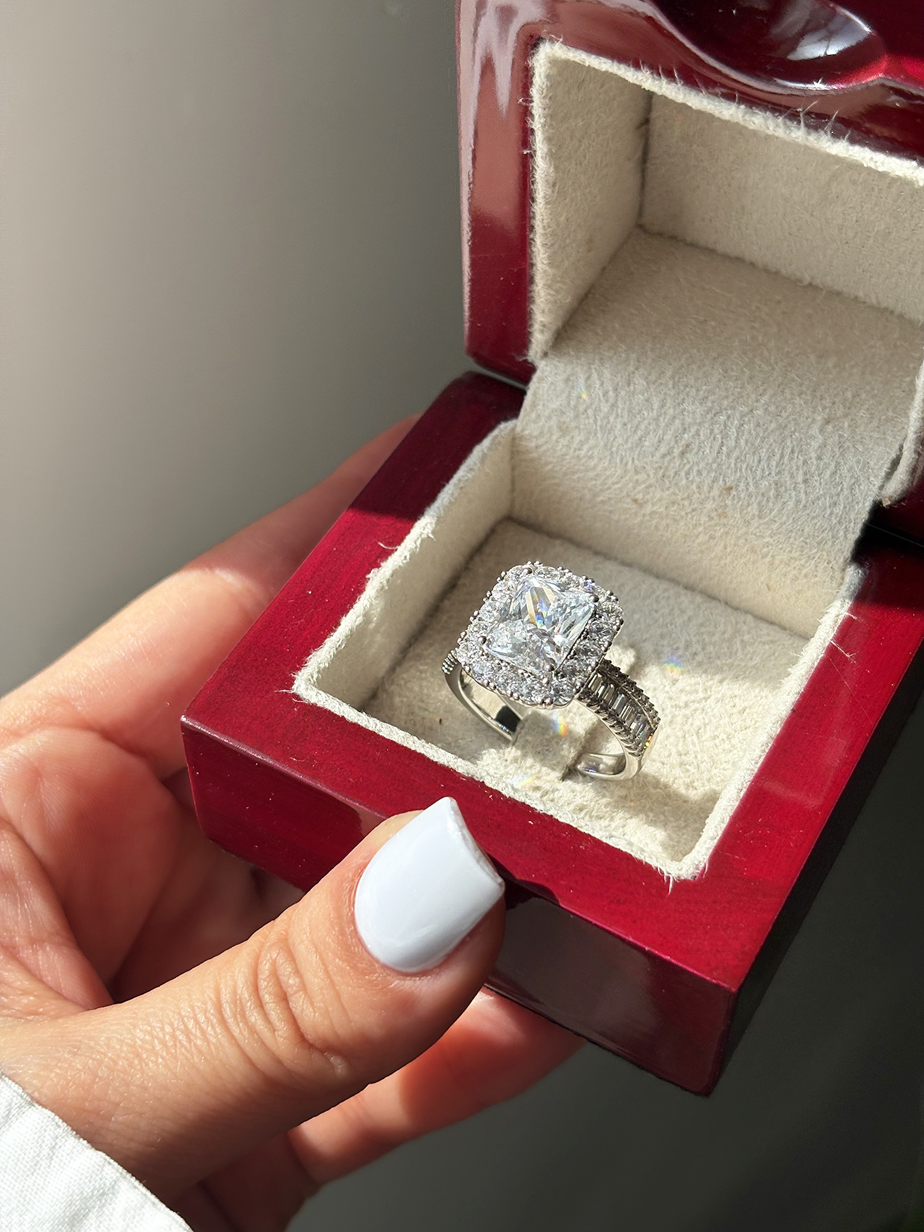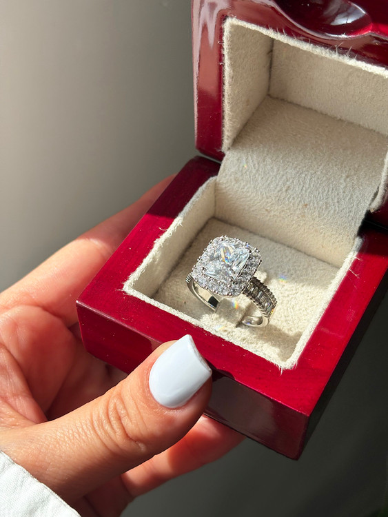 انگشتر نگیندار لوکس با طراحی مربعی و درخشش خیرهکننده، انتخابی خاص برای استایلهای مجلسی و عروسی است. نگین مرکزی درخشان با ردیفی از نگینهای کوچکتر احاطه شده تا جلوهای باشکوه و چشمگیر ایجاد کند. این انگشتر نقرهای براق، ترکیبی از زیبایی، اصالت و ظرافت است و برای بانوانی که به دنبال جواهراتی ماندگار و لاکچری هستند، گزینهای ایدهآل محسوب میشود.