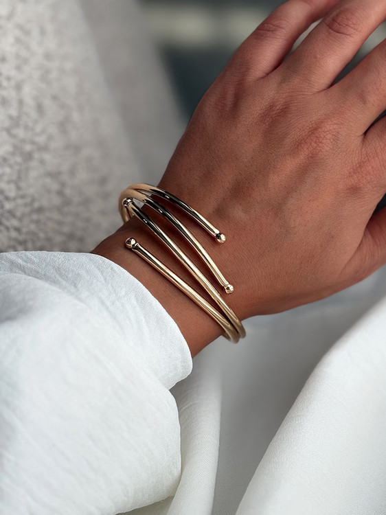 بنگل طلایی لوکس با طراحی چند شاخهای مدرن، انتخابی منحصربهفرد برای استایلهای شیک و امروزی است. این دستبند با فرم باز و انعطافپذیر خود، بهراحتی روی مچ قرار میگیرد و جلوهای خاص به دستان شما میبخشد. ترکیب درخشش فلز طلایی و طراحی هنرمندانه، آن را به اکسسوریای جذاب برای استفاده روزمره یا مهمانیها تبدیل کرده است.