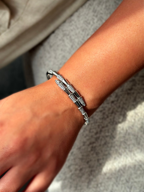 دستبند نقرهای نگیندار با طراحی مدرن و شیک، انتخابی ایدهآل برای بانوانی است که به استایل ظریف و خاص اهمیت میدهند. درخشش نگینهای ریز روی بدنه فلزی براق، جلوهای لوکس و چشمنواز ایجاد کرده است. این دستبند زنانه زیبا مناسب استفاده روزمره یا مجالس رسمی بوده و بهراحتی با ساعت و سایر اکسسوریها ست میشود.